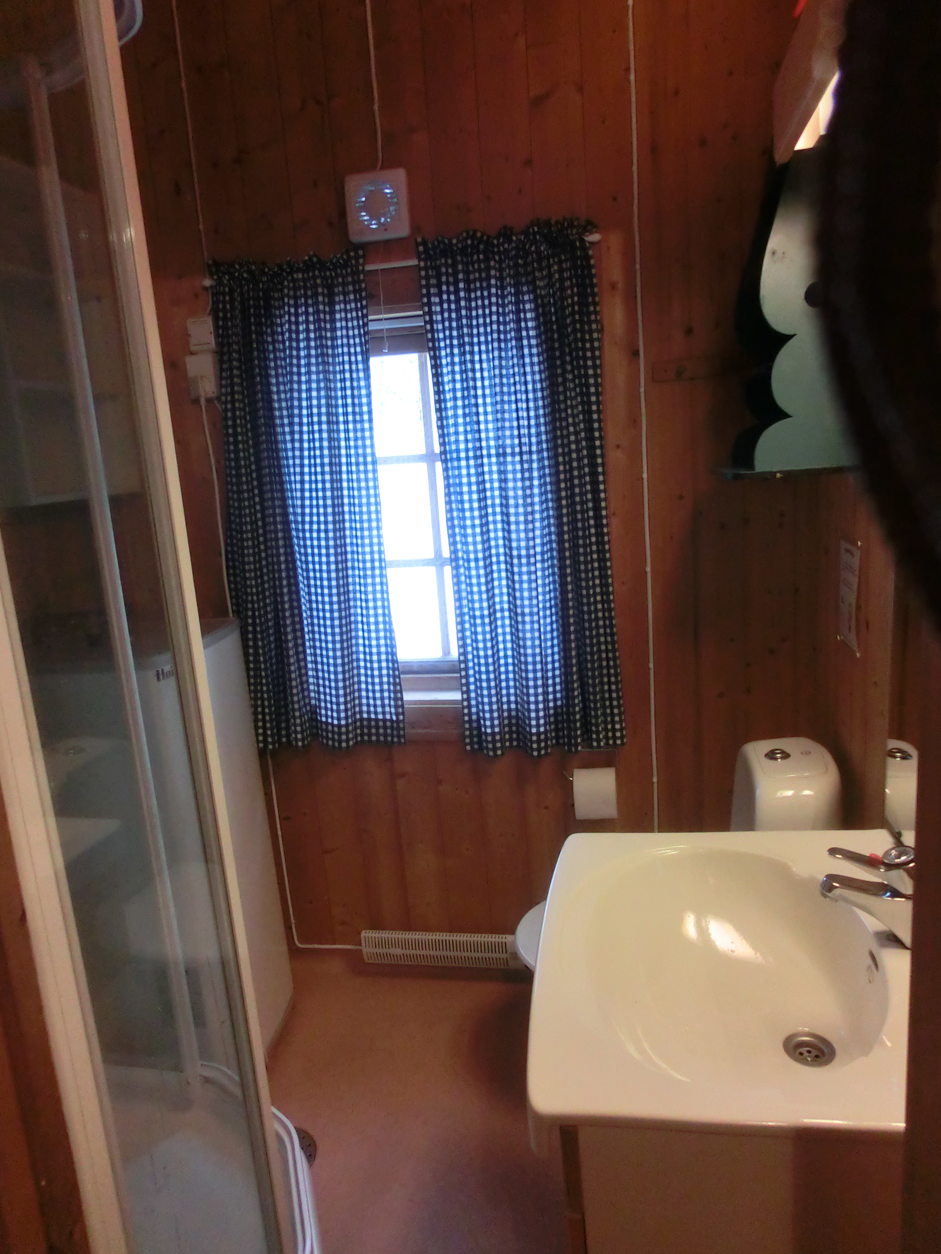 ser du hytta ligger på høyre hånd. Den er merket med Icopal-skilt på veggen.