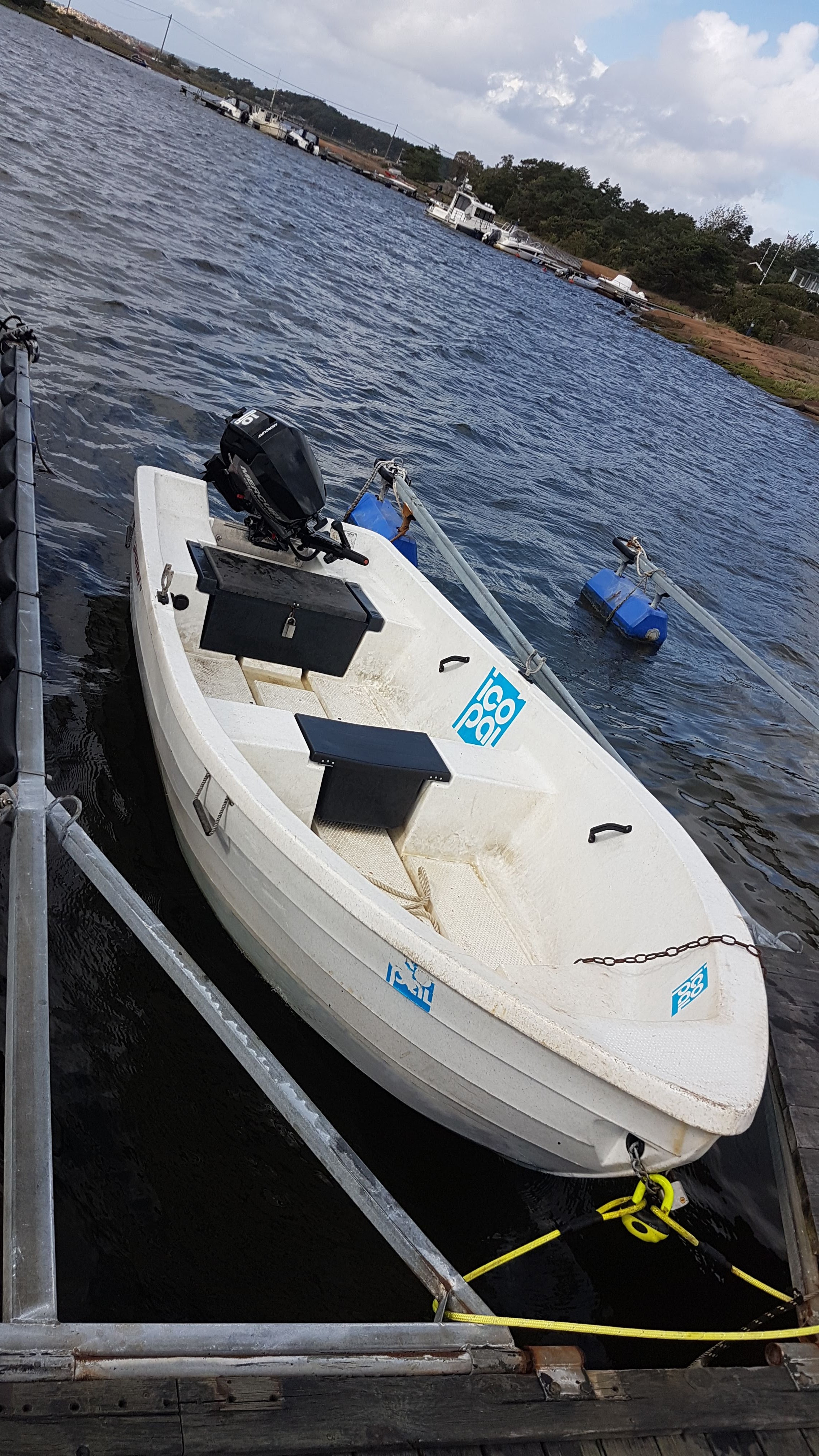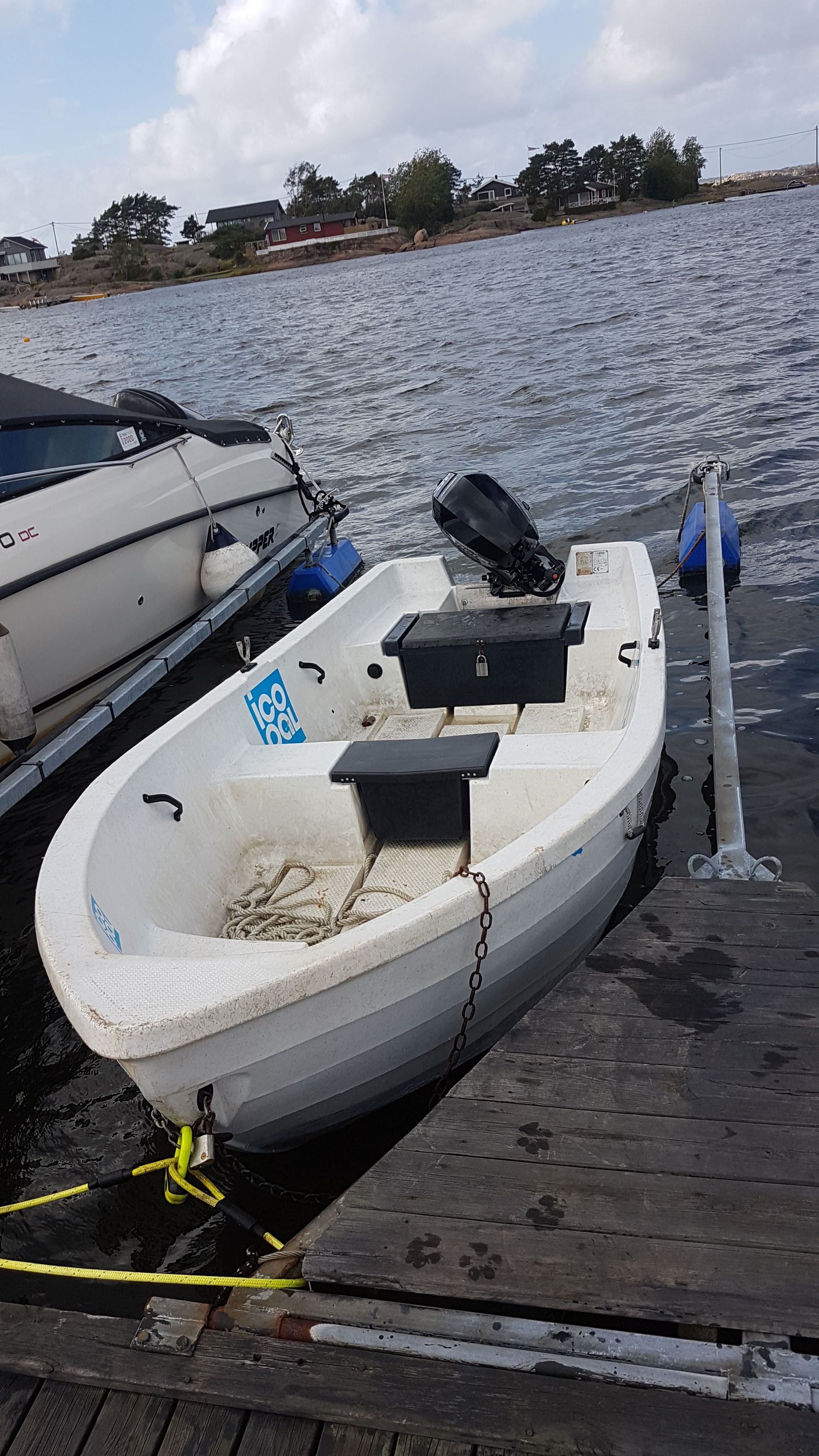 Når du står foran hytta, har du et blått uthus ned til høyre - med bl.a. bensinkanne og årer.Gå rett nedover ca 200 m til brygga. Båten ligger som nr 2 på høyre side, Hvit Pioneer med ny Mercury motor.